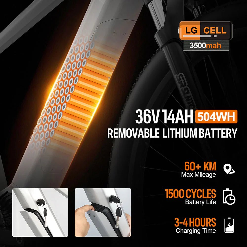 36V14.0Ah, 504Wh, full hidden integrated battery, removable for recharging