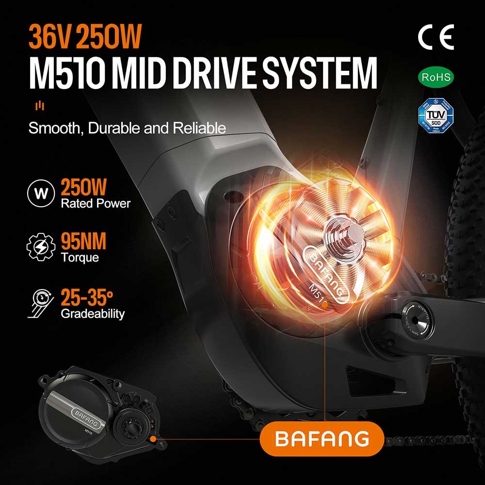 BAFANG M510 36V 250W Mid Motor (MM G522.250.C), max torque 95N.m, peak torque 130N.m top speed 25km/h, max cadence support is extended up to 120RPM