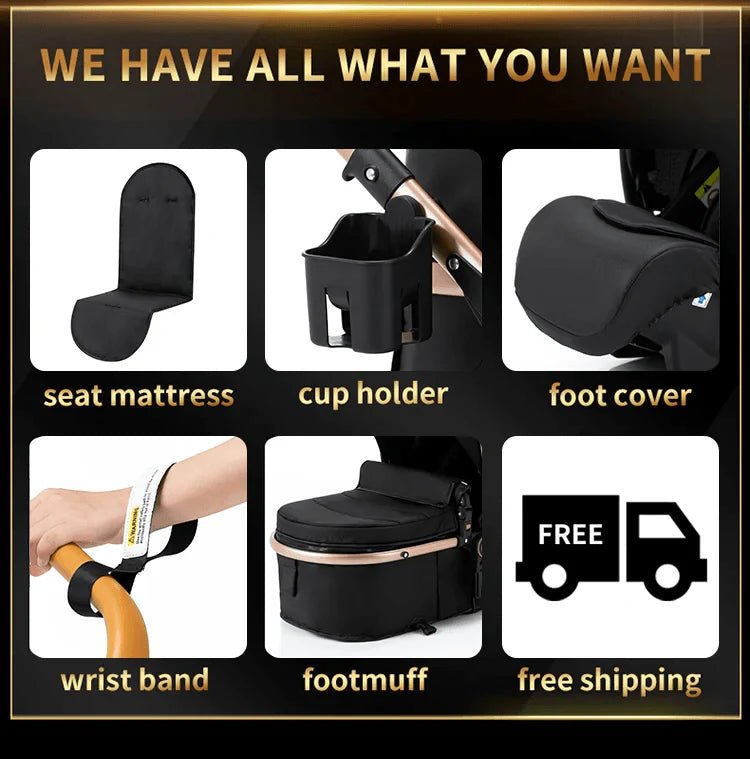 Stroller frame, 2 in 1 basket, baby car seat, 4 wheels, armrest, basket adapter, foot cover, cup holder, cotton pad