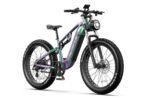The frame and fork of this electric bike are made of durable all-aluminum, ensuring strength and lightweight construction. The bike features a striking color-changing finish (blue and green) for a stylish and dynamic look.
