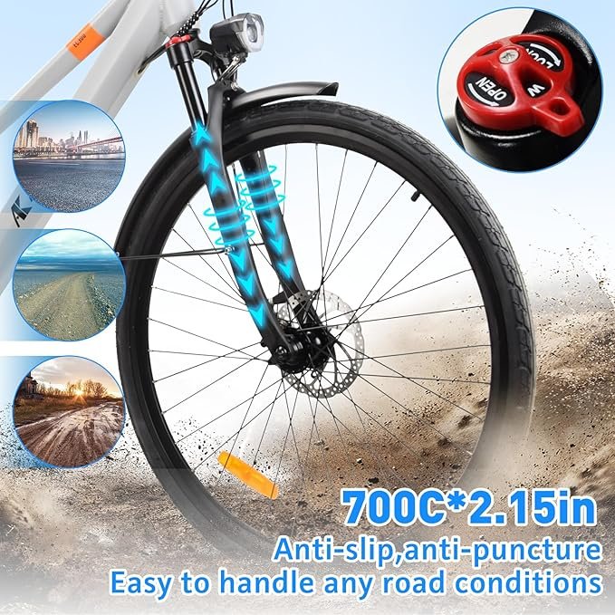 - 【250W Powerful Motor】The electric city bike is powered by a 250W brushless gear motor, has good durability, and has a climbing ability of up to 25°, which can meet the needs of daily commuting and short trips. 700C*2.15″ big tires, saving commute time and adapting to various terrain.